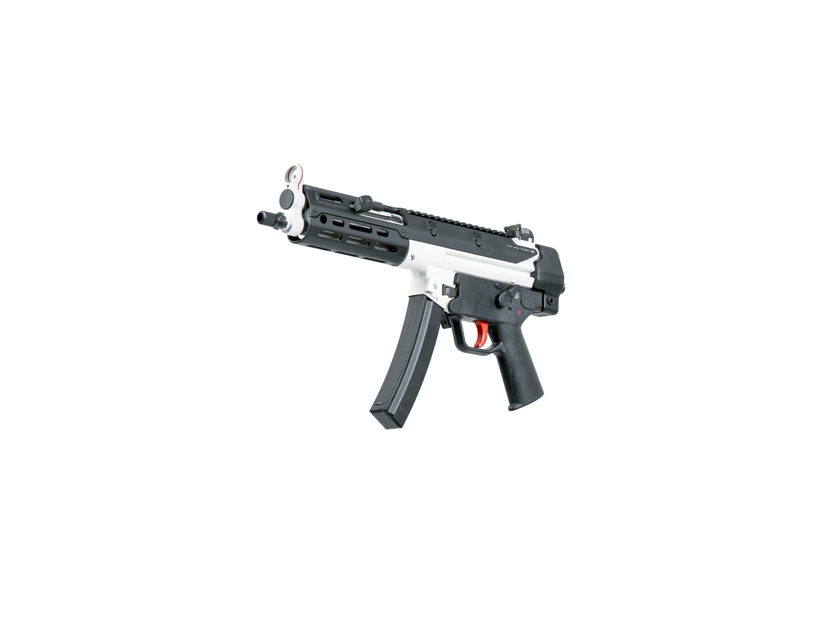 The 9″ nitride heat-treated barrel features a 1:10″ right-hand twist and includes both a 3-lug interface and 1/2×28 threading, supporting suppressor compatibility and common mounting standards. A traditional MP5-pattern claw-style optic mounting interface is retained, preserving legacy mounting options. The custom UTG handguard provides a functional forward grip surface while maintaining the platform’s classic profile.