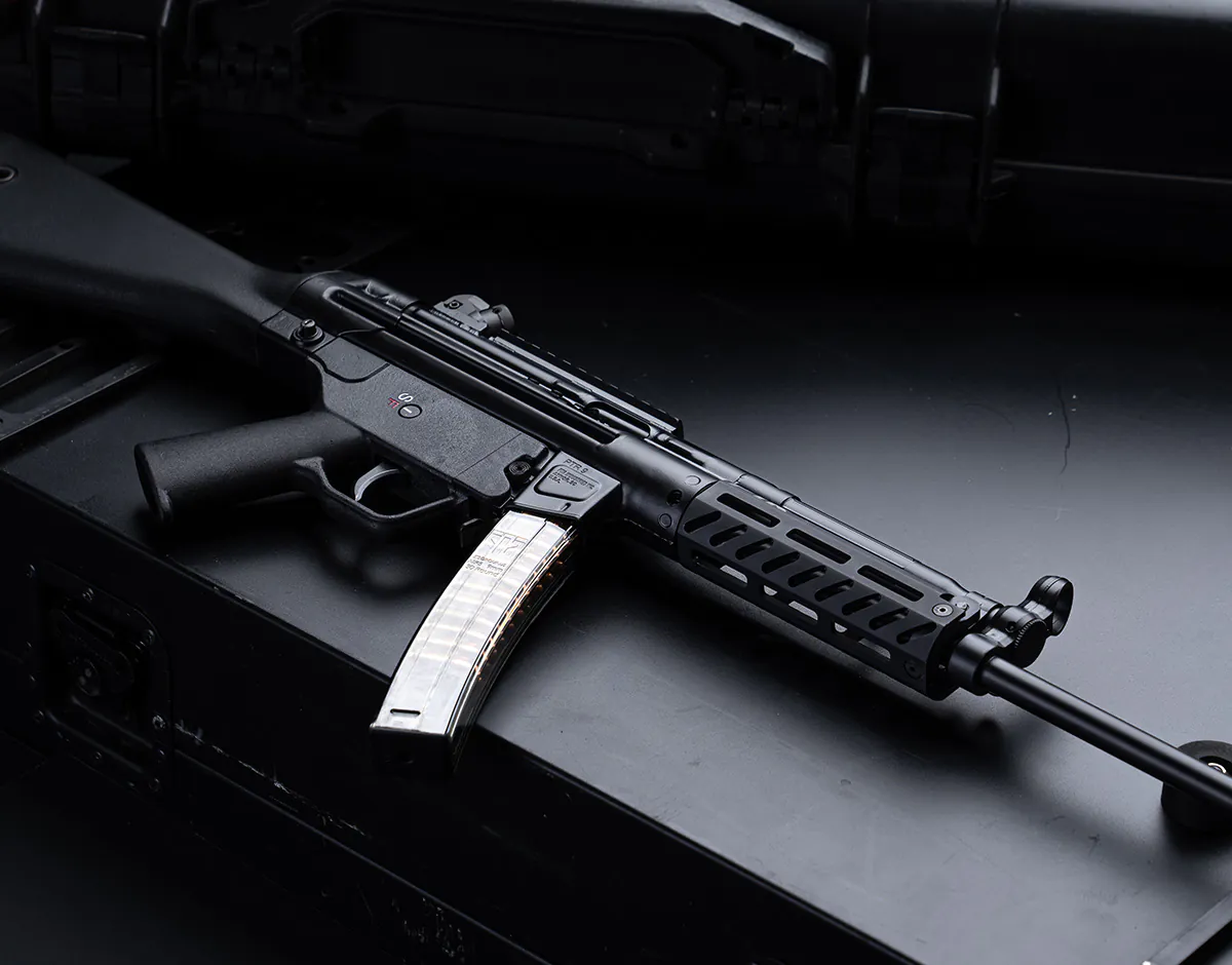 Control and consistency are emphasized throughout the design. The trigger is set to a 9–10 lb pull for reliable operation, and the rifle feeds from steel 30-round magazines. Offered in both standard and California-compliant configurations, the PTR 9R provides a compliant, rifle-length solution for shooters seeking proven subgun performance in a civilian-legal platform.