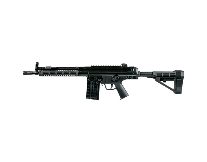 A traditional claw mount anchors your optics, while the slim-line polymer handguard and a 9-10 lbs trigger pull fuse functionality with comfort. It’s equipped with a 20-round aluminum magazine for extended use, measuring 40.5″ in length and weighing 9.5 lbs when unloaded — a perfect balance of size and manageability.