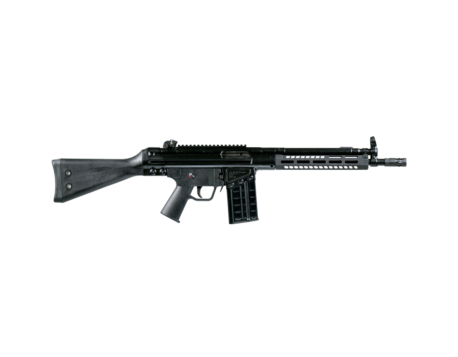 The rifle operates using PTR’s proven roller-delayed blowback system, providing a smooth recoil impulse and consistent cycling with full-power 7.62×51mm ammunition. A heat-treated, full-auto profile bolt carrier supports long-term reliability and sustained operation. The semi-automatic action is host-ready for use with NFA-registered auto sear packs where legally applicable. The overall finish consists of black powder coating over Parkerizing for corrosion resistance and wear protection.